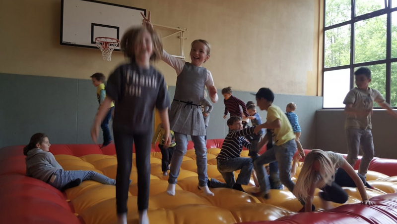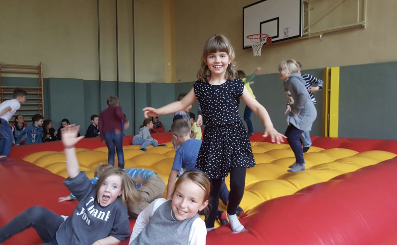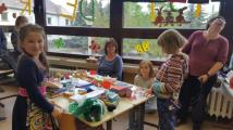Vom Dauerregen ließen wir uns die Stimmung nicht verderben und verlegten alle Aktivitäten kurzerhand ins Trockene. In der Schule wurde fleißig "getrödelt" und auch die Gäste hatten einmal die Gelegenheit, sich in aller Ruhe im Schulgebäude umzusehen. Auch Kaffee und Kuchen, von fleißigen Eltern gebacken, standen bereit. Der Hort sorgte mit leckeren Grillwürstchen für das leibliche Wohl, im Gebäude selbst wurde gebastelt, gemalt und ein Theaterstück der Hortkinder aufgeführt. In der Turnhalle warteten Hüpfburg und eine Spielwiese auf ihre sprunggewaltigen Nutzer.